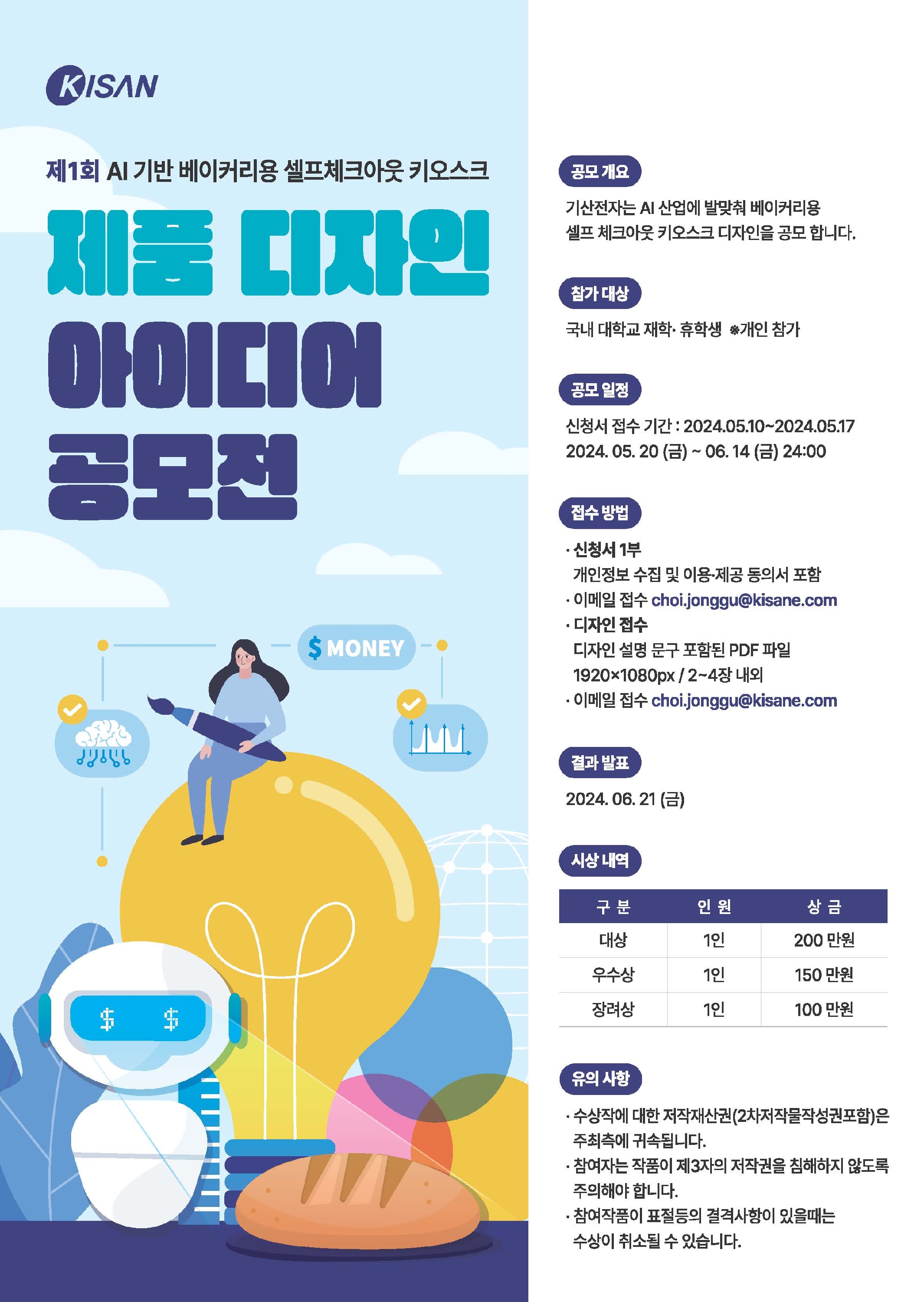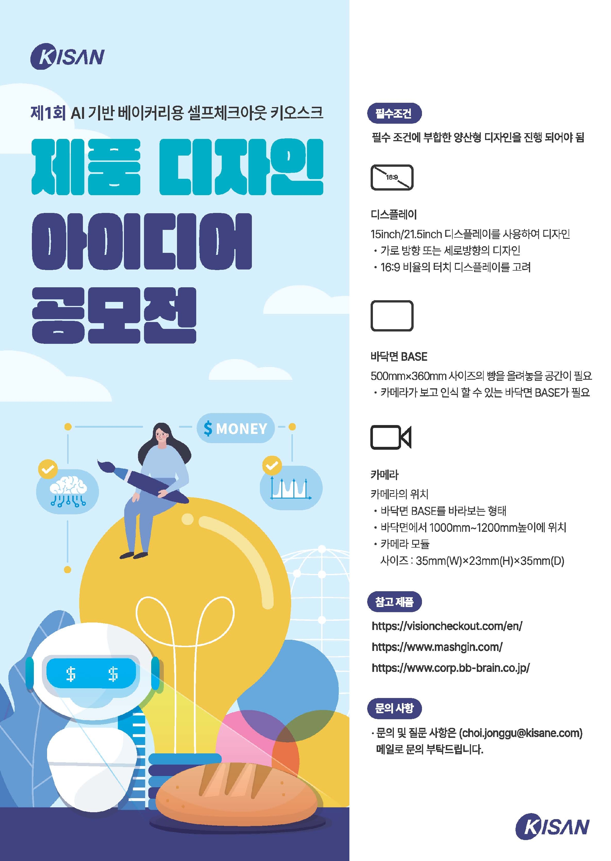 기산전자에서 AI 산업에 발 맞춰 베이커리용 셀프 체크아웃 키오스크 디자인을 공모합니다.