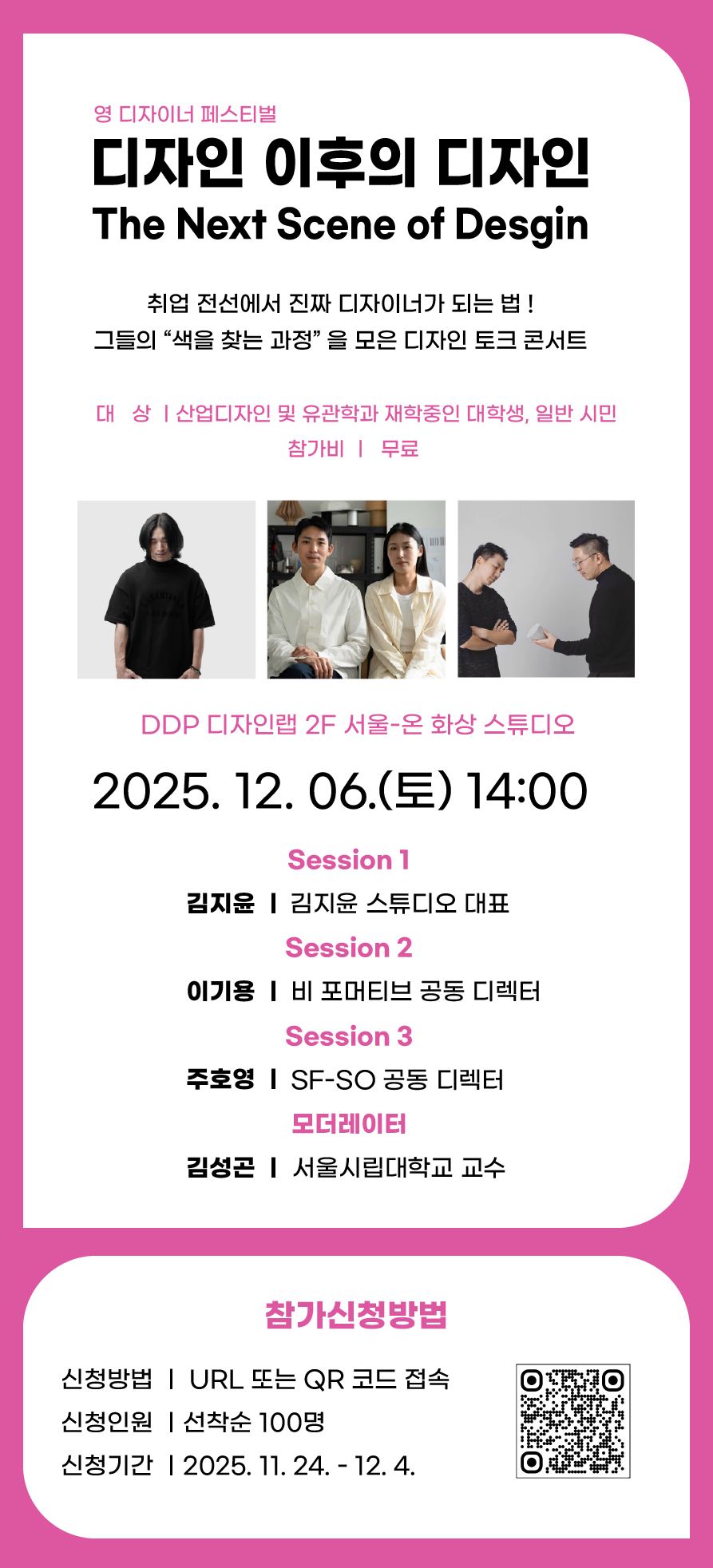 추가로 2025년 12월 6일(토)에는 DDP에서 영디자이너 페스티벌 토크콘서트가 함께 진행됩니다. 산업디자인 분야에서 활동하는 세 명의 디자이너가 작업과정, 실무경험, 진로에 대해 이야기 나누는 의미있는 시간이 마련되어 있으니, 아래 내용확인 후, 신청을 통해 많은 참여 바랍니다.
