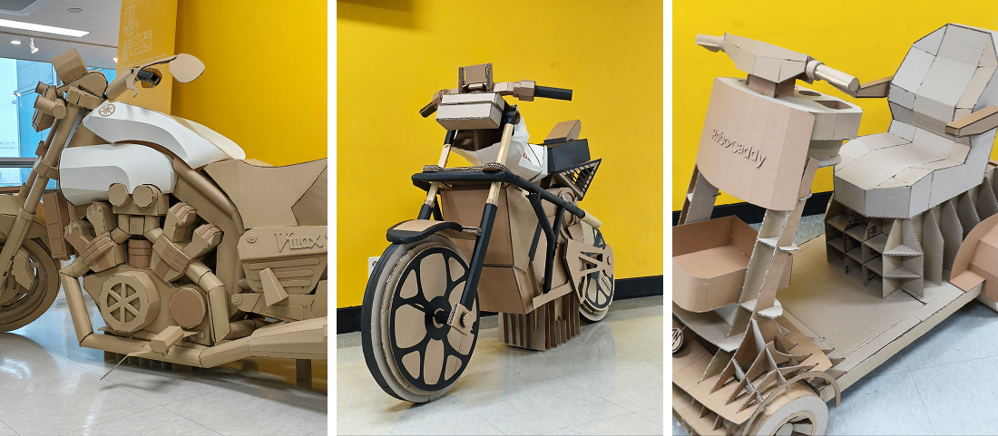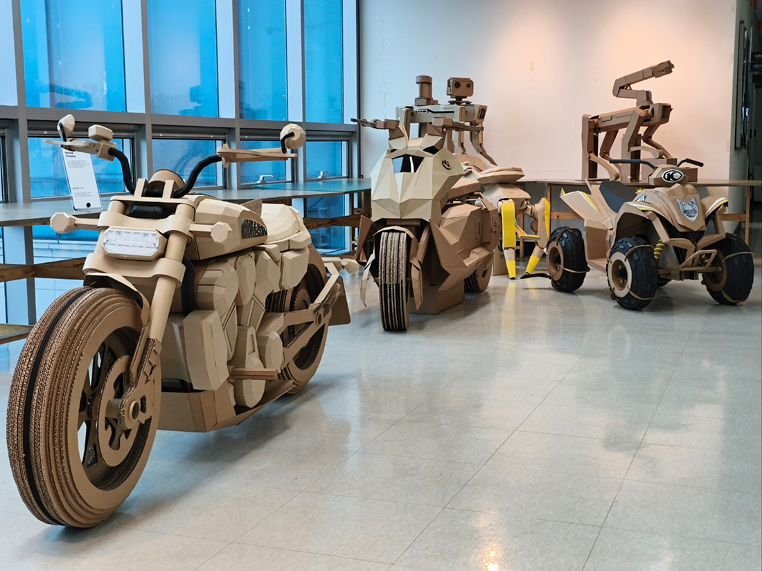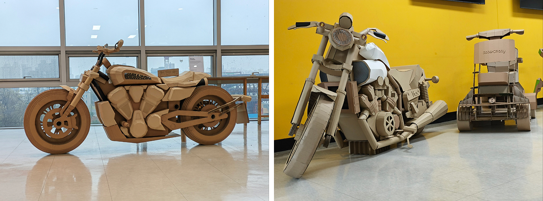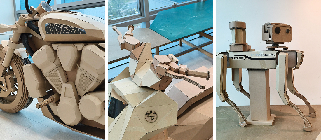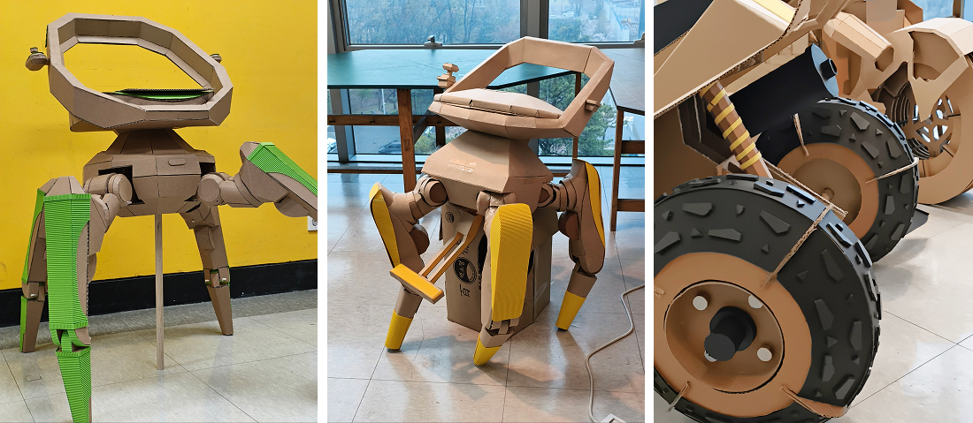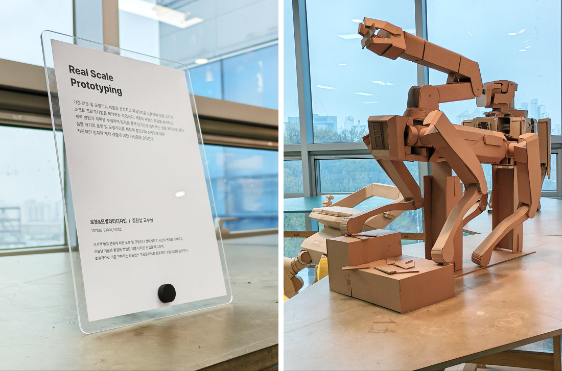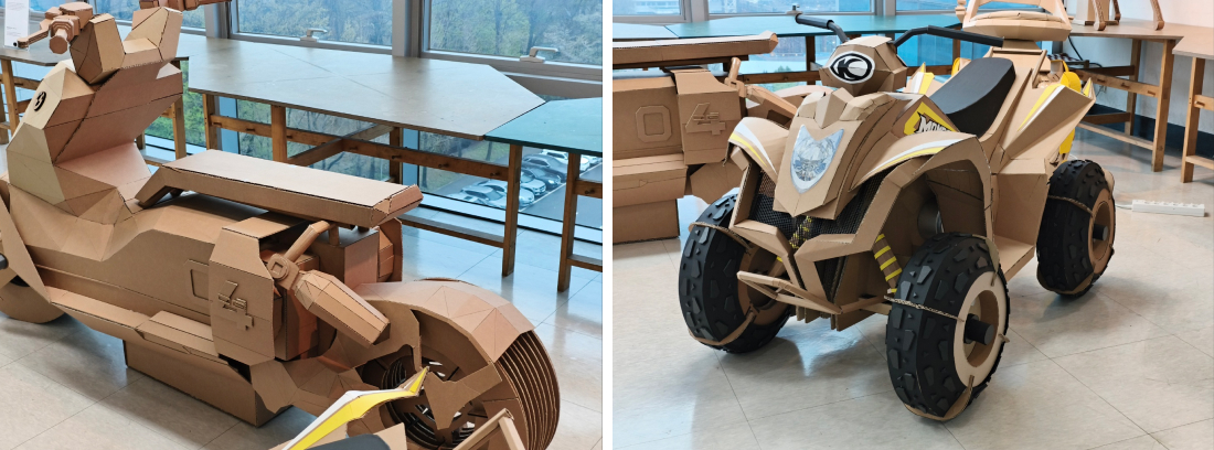 •김원섭 교수님: 로봇모빌리티디자인 Real Scale Prototyping 기존 로봇 및 모빌리티 제품을 선정하고 폐골판지를 사용하여 실물 크기의 소프트 프로토티입을 제작하는 작업이다. 제품의 사양과 특징을 분석하고, 제작 방법과 계획을 수립하여 팀웍을 통해 단기간에 제작하는 것을 목적으로 한다. 실물 크기의 로봇 및 모빌리티를 제작해 봄으로써 스케일에 대한 직관적인 인지와 제작 경험에 대한 자신감을 습득한다.