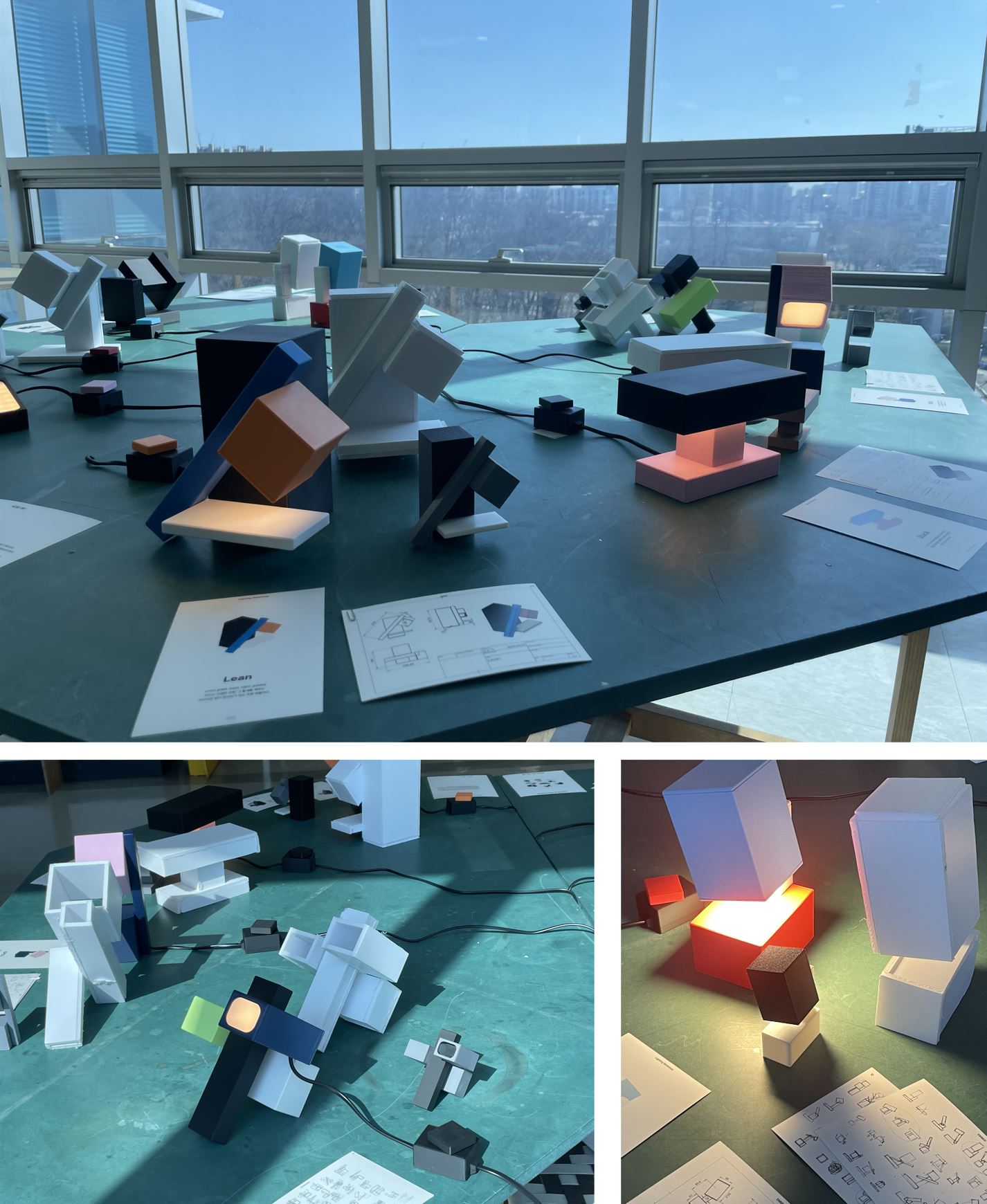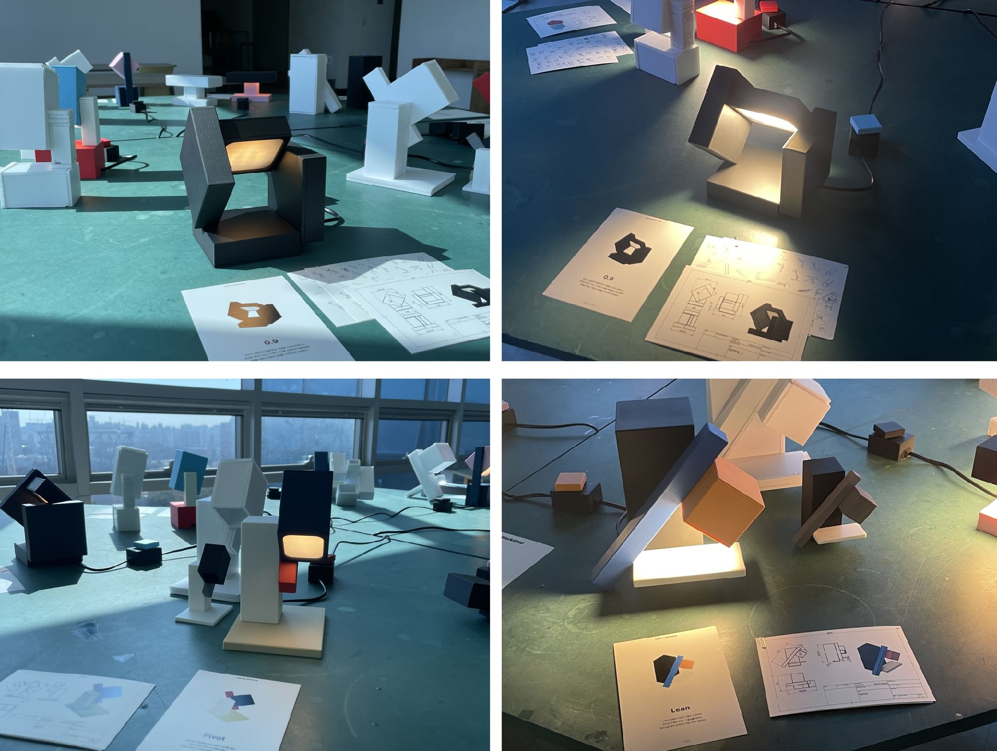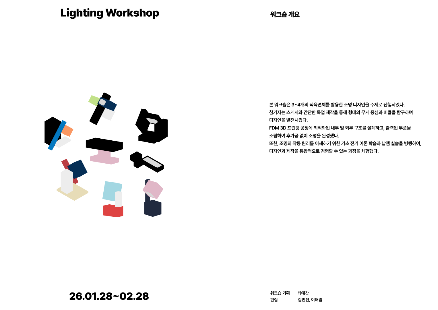 본 워크숍은 산업디자인학과 석사과정 대학원생 최예찬(작가명 YEKKI)의 기획 및 진행으로, 3~4개의 직육면체를 활용한 조명 디자인을 주제로 진행되었습니다. 참가자들은 스케치와 간단한 목업 제작을 통해 형태의 무게 중심과 비율을 탐구하며 디자인을 발전시켰습니다. FDM 3D 프린팅 공정에 최적화된 내부 및 외부 구조를 설계하고, 출력된 부품을 조립하여 후가공 없이 조명을 완성했습니다. 또한 조명의 작동 원리를 이해하기 위한 기초 전기 이론 학습과 납땜 실습을 병행하여, 디자인과 제작을 통합적으로 경험할 수 있는 과정을 체험했습니다.